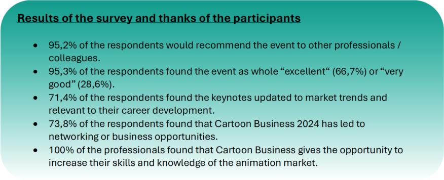 Cartoon Business is a seminar event dedicated to the business models of the animation industry. This industry is going through a period of unprecedented change (general market recession, new technologies, new players, growing ecological awareness, etc.). It has never been so important to provide answers to the questions raised, particularly on the financial and commercial aspects that are worrying the industry. The 2024 edition of Cartoon Business was organised from 18 to 20 November in Brussels.