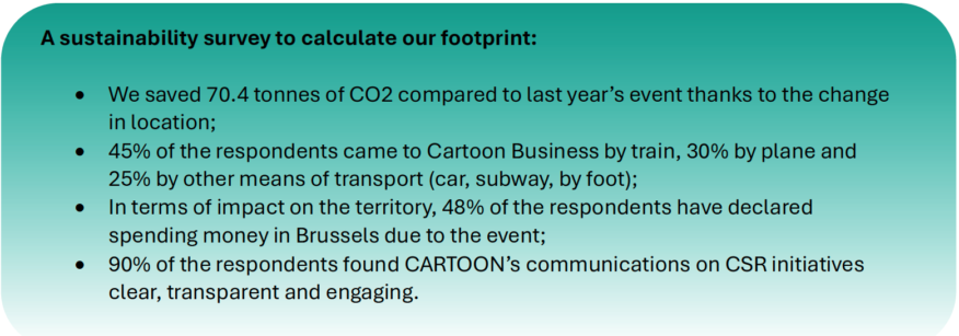 Regarding our sustainable policy, CARTOON is trying to make Cartoon Business greener than ever! On the one hand, we aimed at showing the professionals of the industry that a path to more sustainable productions is possible. On the other hand, a 100% vegetarian lunch was organised to reduce our carbon footprint. We have encouraged participants to travel to Cartoon Business 2024 by train wherever possible. We chose the event venues according to their location, to ensure that they were easily accessible by public transport and on foot (the Comics Art Museum, Autoworld, Le Roy d’Espagne, Restaurant Le Petit Chef, etc.)